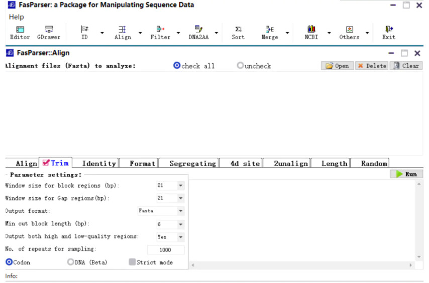 FasParser2该软件是由中国科学院昆明动物研究所孙艳波副研究员所开发 link地址,并于2018年在bioinformatics期刊发表。FasParser2主要是可以在友好界面窗口下对一些常规序列的操作,尤其是对多基因串联合并、序列提取、低质量序列鉴定、快速寻找趋同氨基酸变异位点等进行批处理化。尤其是,该软件增加了有效过滤序列比对质量的模块(滑窗分析),可实现序列中对非同源序列的清除,适用于大规模检测序列中经历达尔文正选择的位点,以及重建系统发育等分析。软件作者通过序列模拟测试发现,其修剪效率非常高,它能够删除95%以上的错误列,且基本不依赖于比对软件的选择,明显优于其他同类程序,如Guidance和Gblocks。另外,经过AlignTrim处理后的比对结果,可显著降低正选择检测中的检阳性事件(低于5%),且不会导致正选择的检测率降低,从而提高了检测正选择基因的准确性。该作者,将其与Gblocks、trimAl软件进行了比较,结果发现FasParser2的处理效果要优于这两款软件。