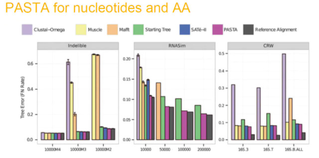 - 数据特性:substitution (≠ mutation) rate strength (↑ vs. ↓), indel size and rate (% gap & gap length), pairwise sequence identity (PID), etc.