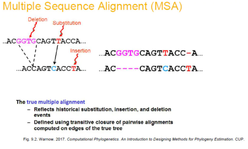 多序列比对表示不同序列中的氨基酸/核苷酸的位点同源性。将序列比对用于进化分析时,处于相同位置的氨基酸/核苷酸位点则被认为在进化上是同源的,并且具有共同的祖先。通过研究序列比对中同源序列是如何随时间变化的,可以推断序列的结构和功能是如何进化的。比如,对多个物种同源序列的比较可以发现发生替换的位点,进而判断出哪个序列在哪个位置发生变化。另外,两个序列之间的长度差异可以通过删除一个序列中的现有碱基位点或插入另一个序列中的新碱基位点来解释。两个序列之间发生替换差异的进化谱系,可以用外群序列来解决,也可以通过推断两个序列的祖先的特征状态来解决。因此,以上所有情况的结论准确性很可能取决于多序列比对(MSA)的准确性。