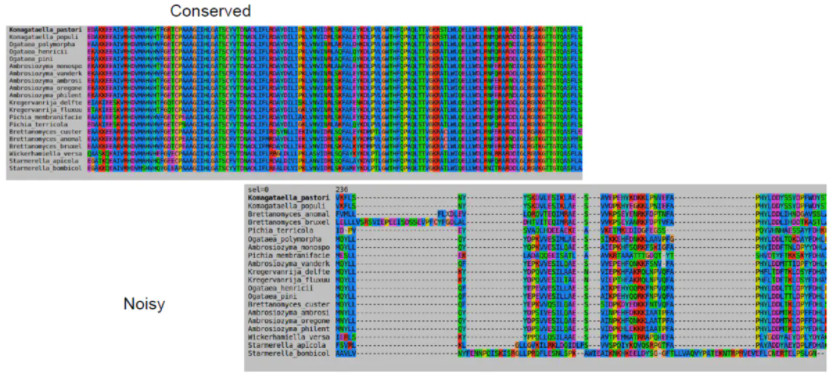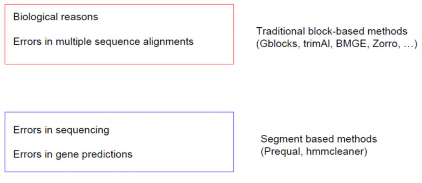 当获得精准的多序列比对后,接下来的任务就是要过滤掉一些低质量以及高变异度的序列区域,仅保留进化保守的区域用于后续分析。其中,产生这些低质量区域的原因主要有两个方面: