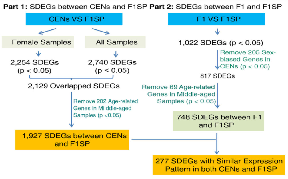 为了检测长寿人群和年轻成人之间基因表达的变化,我们首先使用一个阈值p<0.05来识别CENs和F1SPs之间的显著差异表达基因(DESeq2 package)。