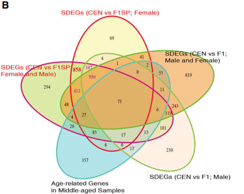 为了确定增强的自噬信号在F1后代中是否也存在,我们还鉴定了F1中与配偶有关的差异表达基因,因为已知的长寿表型是部分可遗传的(遗传力为20%-30%),而且F1受试者的年龄相关疾病的发生率也比普通人群低。