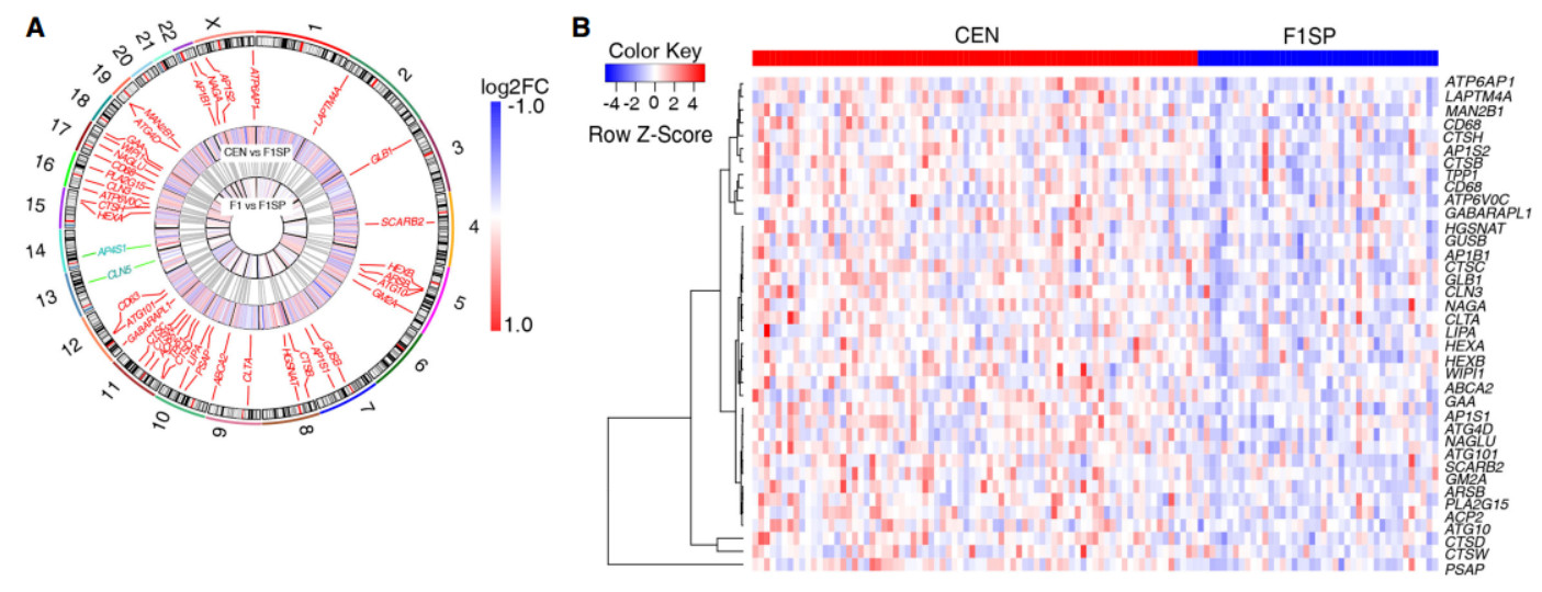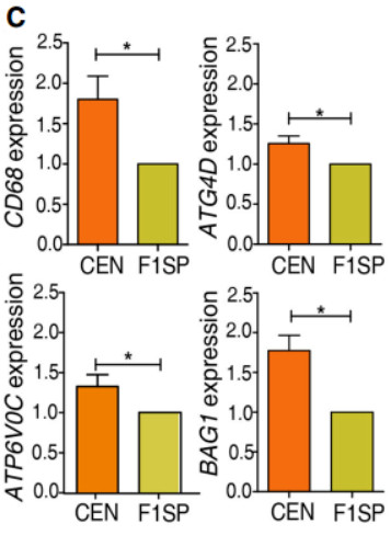 具体来说,在CENs的38个上调的自噬/溶酶体基因中,有8个基因在F1中高表达
