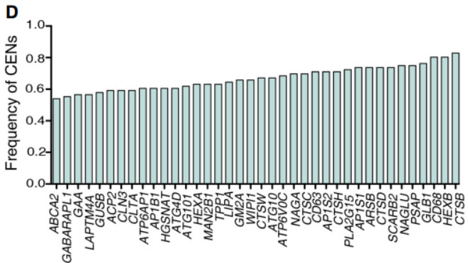 由于溶酶体是自噬溶酶体系统的重要组成部分,在细胞清除和再循环中起着至关重要的作用。我们推测,在自噬-溶酶体系统中,基因表达的特定模式可能超出溶酶体基因。因此,我们对自噬相关基因(Atg)家族成员进行了研究,该家族成员通过将细胞质物质传递到溶酶体来控制自噬体的形成,这是大自噬的一个关键步骤。在33个ATGs中,5个是CEN组和F1SP组之间的SDEGs,它们在CENs中均有上调。