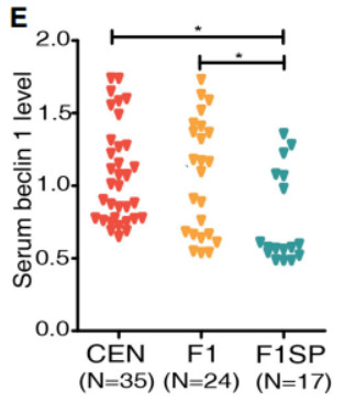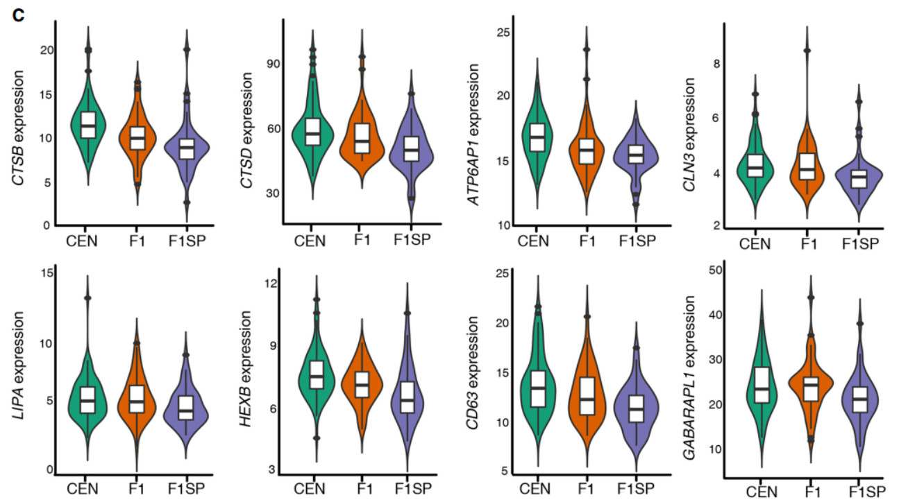 接下来,我们测定了调节溶酶体生物发生和自噬过程的促自噬蛋白,在已进行RNA测序的样本中,包括CENs、F1s和F1SPs。与以前关于长寿种群的研究一致,我们的CEN样本也比F1SP组的血清beclin1浓度高,表明这些CENs中的自噬/溶酶体活性增强。