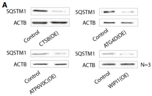 选择了与溶酶体和自噬体功能相关的基因(自噬的两个关键成分):CTSB,一种重要的组织蛋白酶;atp6v0c,维持溶酶体酸性pH的关键因素;atg4d和wipi 1,是自噬体形成的关键成分。这四个基因的过度表达导致了sqstm 1蛋白水平的下降,这是一种众所周知的自噬底物和自噬降解标记物。