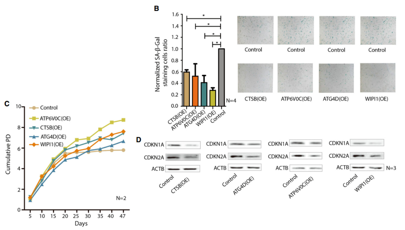 与此相一致的是,这四个基因的过度表达显著降低了衰老相关半乳糖苷酶β1(sa-β-gal)染色的细胞百分率,细胞增殖增强,并抑制CDKN2A和CDKN1A的蛋白水平,这是两个重要的衰老标记等。这些发现表明,至少在细胞水平,上调的SDEGs可以促进自噬功能,从而延缓衰老。